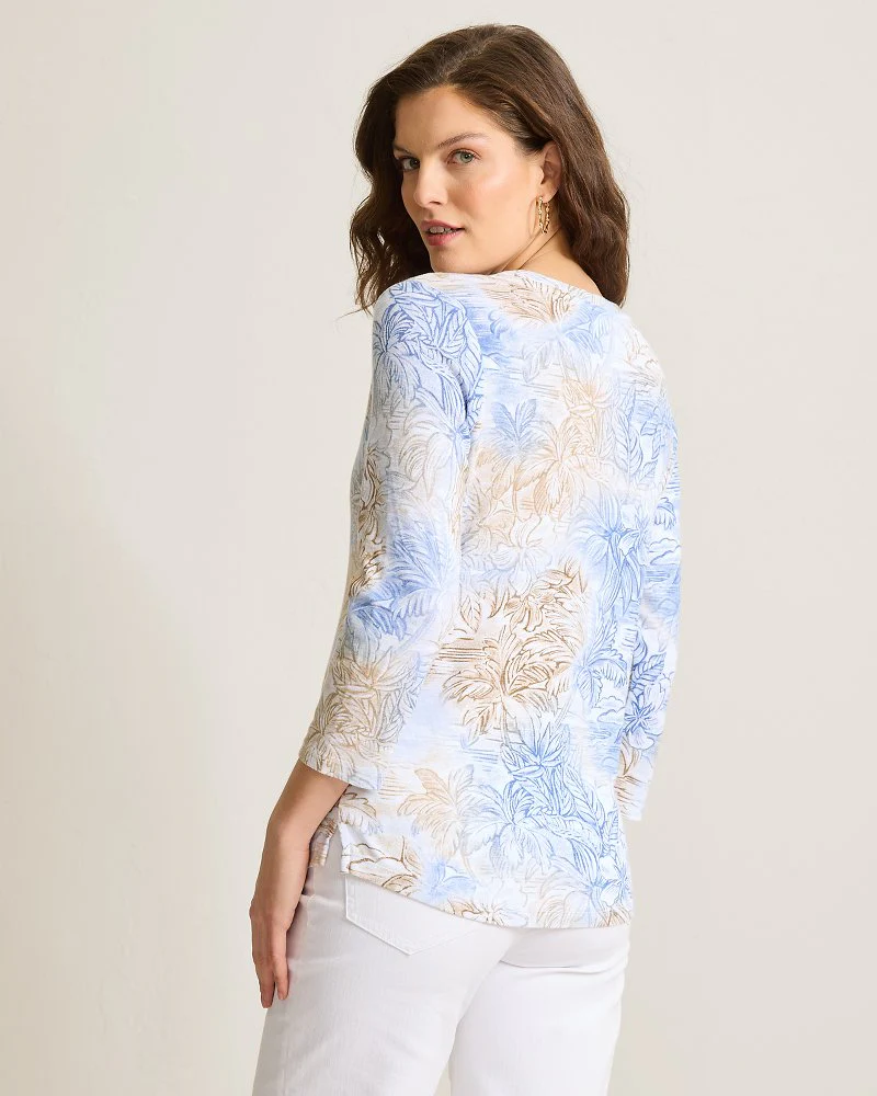 An elegant hibiscus print in tonal beige and coastal blue hues takes you straight to paradise in our bestselling 100% cotton T-shirt style.